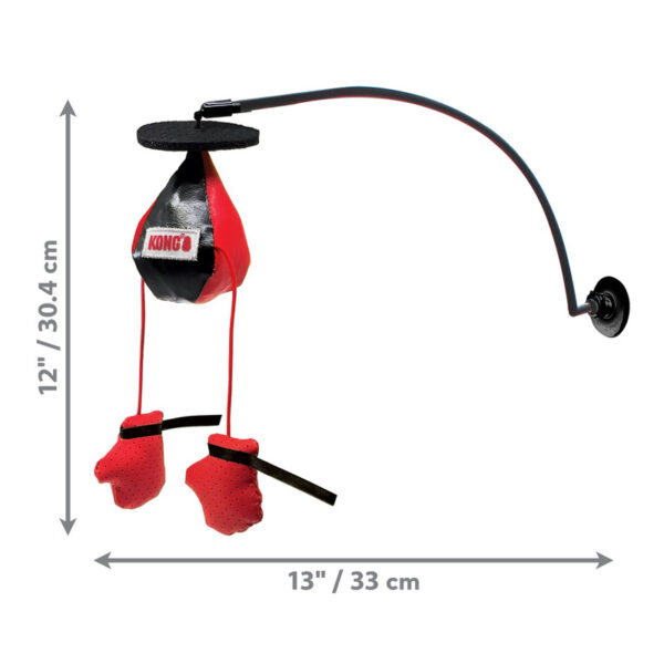 KONG Connects Window Boxing is a portable play gym that knocks out boredom with a multi-sensory prize fight of fun for Kittyweight Champions of the World. Suction cup secures base to any smooth vertical surface. Dynamic Connects Wand enhances irresistible bobbing motion making dangling boxing gloves dance on elastic lines, attracting the eye of the (small) tiger for batting. KONG Premium North American Catnip in gloves fuels extra rounds of fun, while bells and rattle spark hunting instincts.