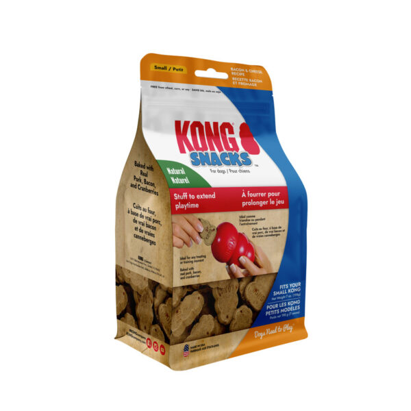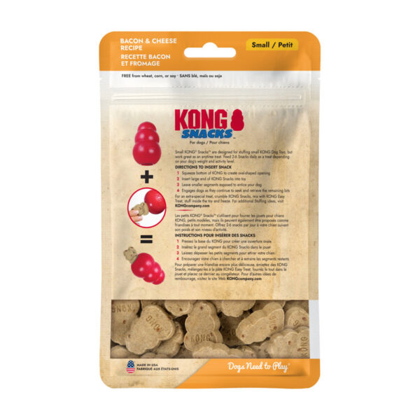 KONG Bacon and Cheese Snacks are made with irresistible bacon and cheddar cheese flavor for a biscuit that is hard to beat. Made in the USA, these high-quality treats are all-natural and do not contain wheat, corn or soy giving them an irresistible flavor that is great for any treating moment. This larger size is specially shaped and sized to fit your dog’s large KONG rubber toy.